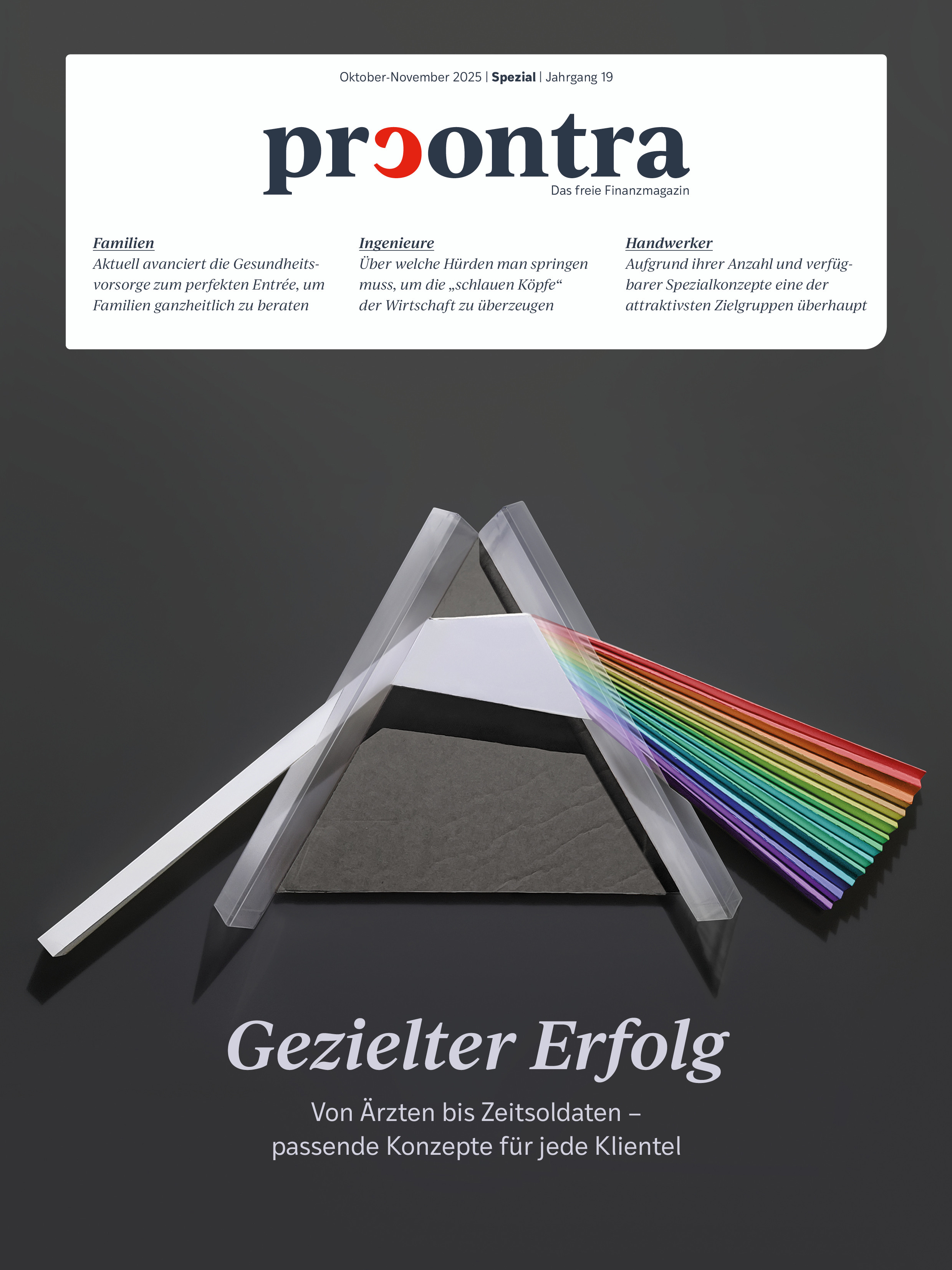 Ausgabe Spezial – Oktober/November Gezielter Erfolg Von Ärzten bis Zeitsoldaten – passende Konzepte für jede Klientel In dieser AusgabeFamilien Aktuell avanciert die Gesundheitsvorsorge zum perfekten Entrée, um Familien ganzheitlich zu beratenIngenieure Über welche Hürden man springen muss, um die „schlauen Köpfe“ der Wirtschaft zu überzeugenHandwerker Aufgrund ihrer Anzahl und verfügbarer Spezialkonzepte eine der attraktivsten Zielgruppen überhauptWeitere ThemenSoldaten | Senioren | Beamte | Gen Z | Landwirte | Ärzte | Frauen | Immobilienbesitzer | Fahrradbesitzer